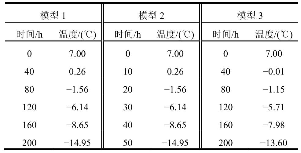 模型1 模型2 模型3时间/h 温度/(℃) 时间/h 温度/(℃) 时间/h 温度/(℃)0 7.00 0 7.00 0 7.00 40 0.26 10 0.26 40 -0.01 80 -1.56 20 -1.56 80 -1.15 120 -6.14 30 -6.14 120 -5.71 160 -8.65 40 -8.65 160 -7.98 200 -14.95 50 -14.95 200 -13.60
