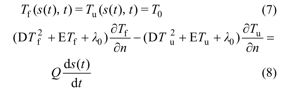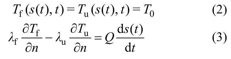 式中:T0为土体相变温度;Tf、Tu分别表示冻土温度和融土温度;λf为冻土的导热系数;n为土体边界的外法线方向;λu为融土的导热系数;Q为单位体积土体的相变潜热;s为冻结锋面的位置。