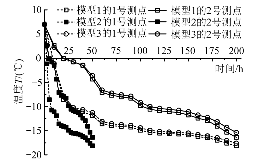 由图3和表8可知,模型1、模型3的温度曲线均存在一定误差。既有的文献也表明[21],考虑热参数随温度变化的冻土温度场预测精度更高,即采用非线性理论推导的相似准则具有更高的预测精度。将模型2乘以时间缩比1,可发现模型1与模型2之间相应测温点对应时刻的温度值相等,即符合模型1与模型2之间的温度缩比为1。这表明,由理论得到的相似准则和采用原土进行模型试验时,原型与模型之间应满足的相似关系是成立的。