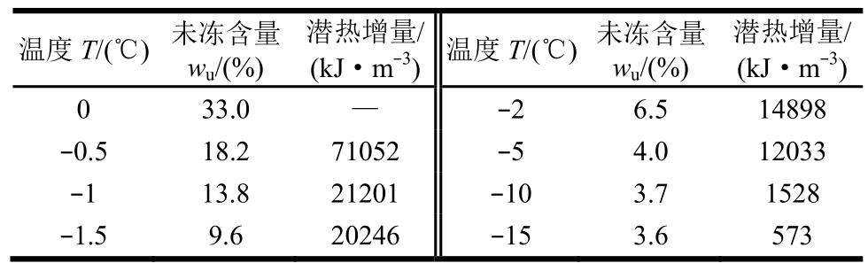 温度T/(℃)未冻含量wu/(%)潜热增量/(kJ·m-3)温度T/(℃) 未冻含量wu/(%)潜热增量/(kJ·m-3)0 33.0 — -2 6.5 14898-0.5 18.2 71052 -5 4.0 12033-1 13.8 21201 -10 3.7 1528-1.5 9.6 20246 -15 3.6 573