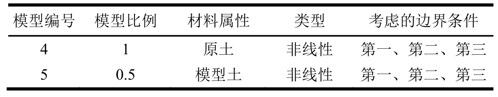 模型编号 模型比例 材料属性 类型 考虑的边界条件4 1 原土 非线性 第一、第二、第三5 0.5 模型土 非线性 第一、第二、第三
