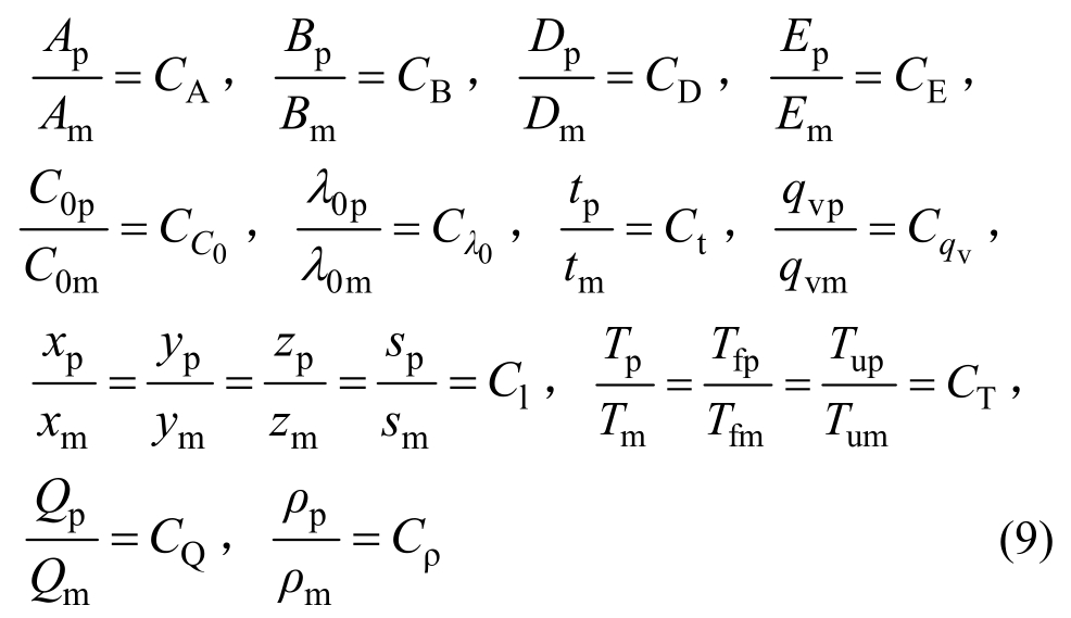 基于相似变换法进行了相似准则的推导。首先定义式(4)和式(8)中各参量的相似变换,即: