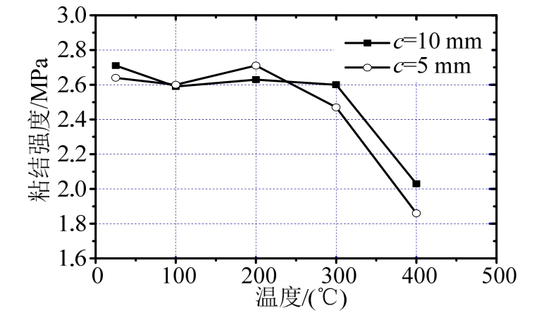 为考察地聚物砂浆与纤维编织网的高温粘结性能,对两种不同表层地聚物砂浆厚度(5 mm和10 mm)的 24个双剪试件分别进行了 100 ℃、200 ℃、300 ℃和 400 ℃高温后的拉伸试验(每种温度3个试件),试件的粘结长度均为50 mm,以保证试件发生粘结破坏。图3给出了两种不同表层地聚物砂浆厚度的纤维编织网-地聚物砂浆双剪试件的粘结强度随温度的变化曲线。由图可知,在温度不超过300 ℃时,地聚物砂浆的粘结强度随温度增加而变化不大,温度超过300 ℃以后粘结强度快速下降,但即使在 400 ℃时粘结强度仍有常温强度的70%。而环氧树脂的玻璃化温度通常仅为 80 ℃左右,在120 ℃左右环氧树脂与纤维布之间的界面粘结强度几乎完全丧失[16]。此外,从图3还可以看到,表层地聚物砂浆厚度为 10 mm的双剪试件在300 ℃、400 ℃高温后强度下降幅度较5 mm厚的试件小,这是因为地聚物砂浆保护层具有一定的隔热作用。利用这点,可以在TRGM加固层的表面涂抹一定厚度的地聚物砂浆作为防火保护。