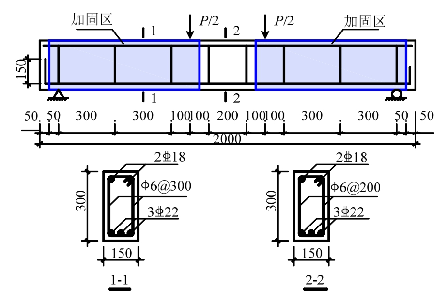 22,以使试验梁在抗剪加固后剪切破坏仍先于弯曲破坏发生。试件尺寸和截面配筋如图4所示,钢筋强度实测值见表4。