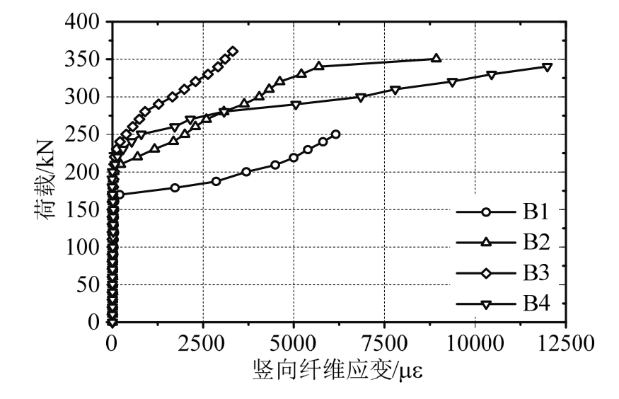 为探究加固层纤维编织网在加载过程中的受力情况,在支座与加载点连线上的竖向纤维和水平纤维上均粘贴了应变片。图 10给出了斜裂缝穿过处的竖向纤维应变与荷载的关系曲线。由图 10可知,竖向纤维应变与箍筋应变的发展规律有些类似,在加载前期阶段竖向纤维应变很小,纤维的作用发挥不大,但荷载增大至一定程度后,纤维应变快速增大。比较图9和图10后发现,竖向纤维应变开始快速增加时所对应的荷载高于箍筋应变开始急剧增加时的荷载,即在箍筋应变急剧增长之后,竖向纤维应变才开始快速增长,竖向纤维应变增长略滞后于箍筋应变增长。比较 TRGM 加固梁B1、B2和B3的竖向纤维应变可知,三层纤维编织网加固梁在破坏时竖向纤维应变相对较小,这说明纤维编织网的强度没有得到充分利用,而两层纤维编织网加固梁破坏时的竖向纤维应变较大,说明纤维强度的利用程度较高。比较同为一层纤维编织网加固的梁B1和B4可以看到,环氧树脂粘贴加固的梁B4破坏时的竖向纤维应变几乎是地聚物砂浆粘贴加固的两倍,这也就是梁B4相对于未加固梁的抗剪承载力增加幅度是梁B1的两倍的原因。