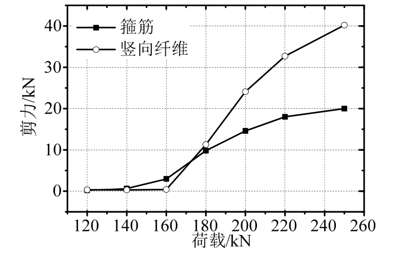 由图可知,在加载的前期,箍筋发挥的作用较大;但当加载至 180 kN左右时,竖向纤维承担的剪力开始大于箍筋的;当箍筋屈服后,箍筋承担的剪力几乎不再增加,而此时竖向纤维承担的剪力还在继续增加,因此梁的荷载还可以继续加大。当试件破坏时,竖向纤维承担的剪力约为箍筋的两倍。