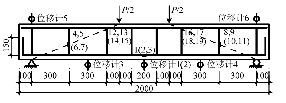 采用量程为 500 kN的千斤顶通过分配钢梁进行两点集中加载,荷载大小通过力传感器读取和控制,加载装置如图5所示。正式加载时以每级10 kN的荷载步长加载至剪压区出现斜裂缝,之后以5 kN的步长逐级递增加载至试件破坏。试验过程中采用位移计量测每级荷载下试验梁的挠度,通过应变片量测钢筋和纤维编织网的应变值,箍筋和纤维编织网上的应变片均布置在支座与加载点的连线上,位移计和箍筋应变片的具体布置位置如图6所示,其中括号内的数字为梁另一侧面相应位置处的测点编号。力传感器、位移计和应变片的数据采用东华DH3816静态应变采集系统同步采集。