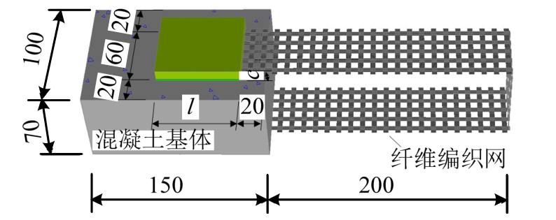 制作试件时,首先浇筑 70 mm×100 mm×150 mm的素混凝土试块作为基体,标准养护28 d后去除基体粘结面上的水泥浆薄层,并在其表面浇水,待湿水饱和面干后在基体表面涂抹1层2 mm~3 mm厚的地聚物砂浆作为底胶,然后粘贴预先裁剪好的纤维编织网,最后在纤维编织网表面涂抹1层5 mm或10 mm厚的地聚物砂浆作为保护层。待地聚物砂浆终凝后,采用同样的方法粘贴基体另一面的纤维编织网。由于地聚物砂浆早期强度高,7 d强度已基本稳定,因此将试件表面覆盖薄膜标准养护 7 d后进行加载试验或高温受热。