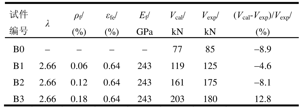 试件编号λρf/(%)εfe/(%)Ef/GPaVcal/kNVexp/kN(Vcal-Vexp)/Vexp/(%)B0 - - - - 77 85 -8.9 B1 2.66 0.06 0.64 243 119 125 -4.6 B2 2.66 0.12 0.64 243 161 175 -8.1 B3 2.66 0.18 0.64 243 203 180 12.8