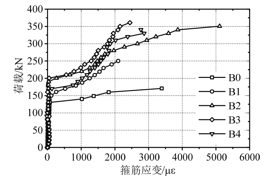 选取斜裂缝穿过处的箍筋应变片绘制荷载与箍筋应变关系曲线,如图9所示。可以看出,未加固梁的箍筋应变经历了两个阶段,即斜裂缝出现前的弹性变化阶段、斜裂缝出现后荷载增长较小而箍筋应变急剧增加的阶段;而加固梁的箍筋应变除经历这两个阶段外,还有第三个阶段,即荷载和箍筋应变均较快增长的阶段。这是因为随着斜裂缝的开展,箍筋应变急剧增加,但当加固梁中的纤维束开始发挥作用并分担剪力后,斜裂缝的发展得到一定程度抑制,箍筋应变的增长速度放缓,荷载继续上升。此外,从图9还可以看出,随加固层数增多,箍筋应变开始急剧增加,所对应的荷载值也逐渐增大,这与弯剪区开裂荷载随加固层数增加而增大的现象一致。此外,无论是未加固梁还是TRGM、FRP加固梁,构件破坏时箍筋应变均达到了屈服应变。