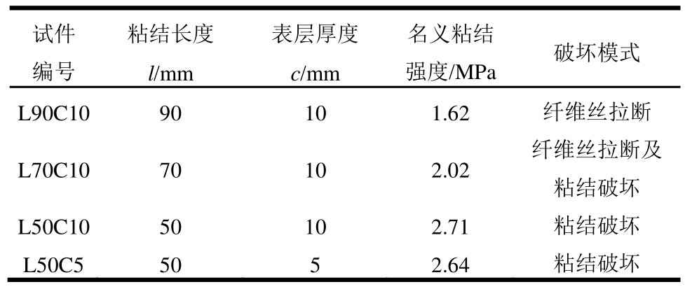 试件编号粘结长度l/mm表层厚度c/mm名义粘结强度/MPa 破坏模式L90C10 90 10 1.62 纤维丝拉断L70C10 70 10 2.02 纤维丝拉断及粘结破坏L50C10 50 10 2.71 粘结破坏L50C5 50 5 2.64 粘结破坏
