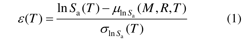根据概率地震危险性的合成分解方法可以得到符合一致概率的反应谱均值和反应谱方差,但在指定的震级和震中距以及超越概率条件下,一次地震动反应谱值会与统计所得的均值反应有一定的差距,即ε参数[30](见式(1))。