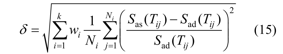 叶献国和王德才[67]也认为,可以在多个频段内考虑反应谱与目标谱的匹配,并在Iervolino等[59]研究(式(10))的基础上,在误差参数δ计算时引入了权重系数wi,如式(15)所示: