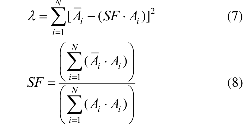 。Eurocode 8 (EC8)中规定此范围为0.2T1~2T1,Uniform Building Code 1997(UBC97)为0.2T1~1.5T1,ASCE 7-05则规定在0.2T1~1.5T1范围内,所选记录反应谱要大于设计谱。由于ASCE7-05中没有详细规定具体做法,Kalkan和Chopra[45]利用最小二乘法,采用经过缩放的反应谱与目标谱之差的平方和λ作为控制参数(式(7)),取dλ / dSF ≅ 0,得出能使得 λ最小的缩放系数SF(式(8))。