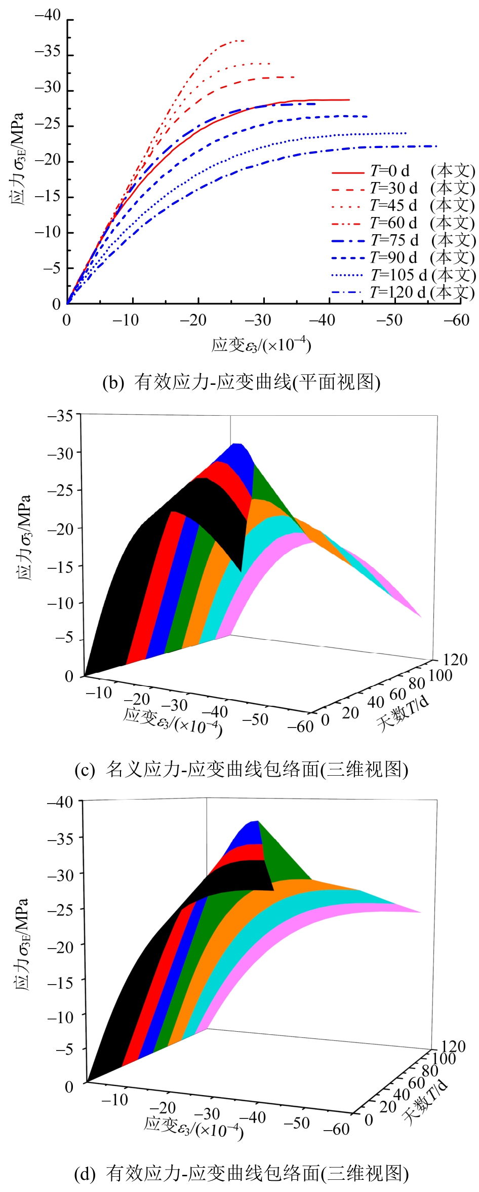 为临界状态对应应变、名义应力和有效应力)随硫酸盐溶液侵蚀时间T变化曲线。当T相同时,满足![]()