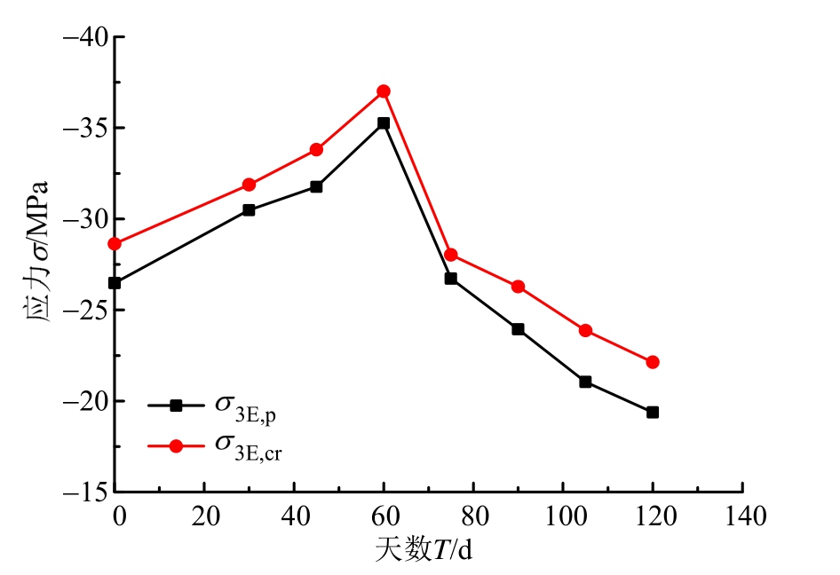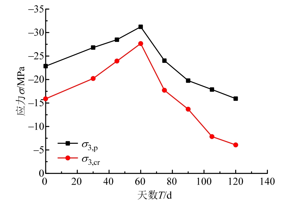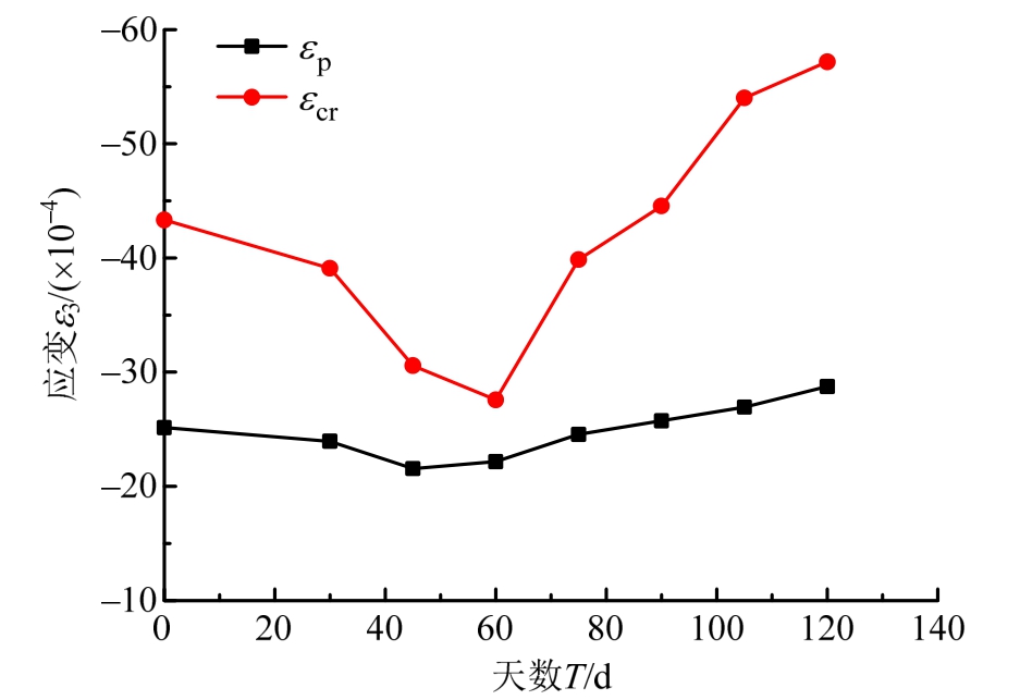 随着侵蚀时间T的增大,σ3,p、σ3E,p、σ3,cr、σ3E,cr 先增大后减小,均在T=60 d时达到最大值;εp、εcr先减小后增大,εp在T=45 d时达到最小值,εcr在T=60 d时达到最小值,整个侵蚀过程中εp变化幅度较小。