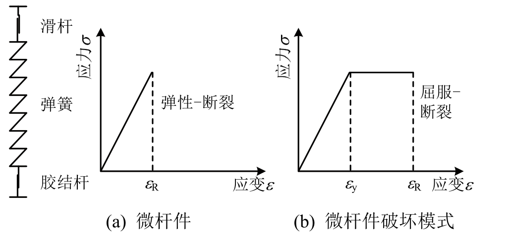 1) 细观损伤机制概括为两类损伤模式:① 断裂损伤,表征微裂纹的萌生、扩展;② 屈服损伤,表征微裂纹的相互作用及微结构受力骨架的调整。可分别用细观单元(微杆件)的断裂和屈服进行表征。如图2所示,每个微杆件由弹簧、滑片、胶结杆三部分组成,并被赋予两个特征应变(断裂应变εR和屈服应变εy),微杆件存在弹性-断裂和屈服-断裂两种破坏模式,假设两特征应变各自服从独立的统计分布形式。混凝土变形破坏本质上为细观断裂、屈服损伤模式的连续累积演化过程。