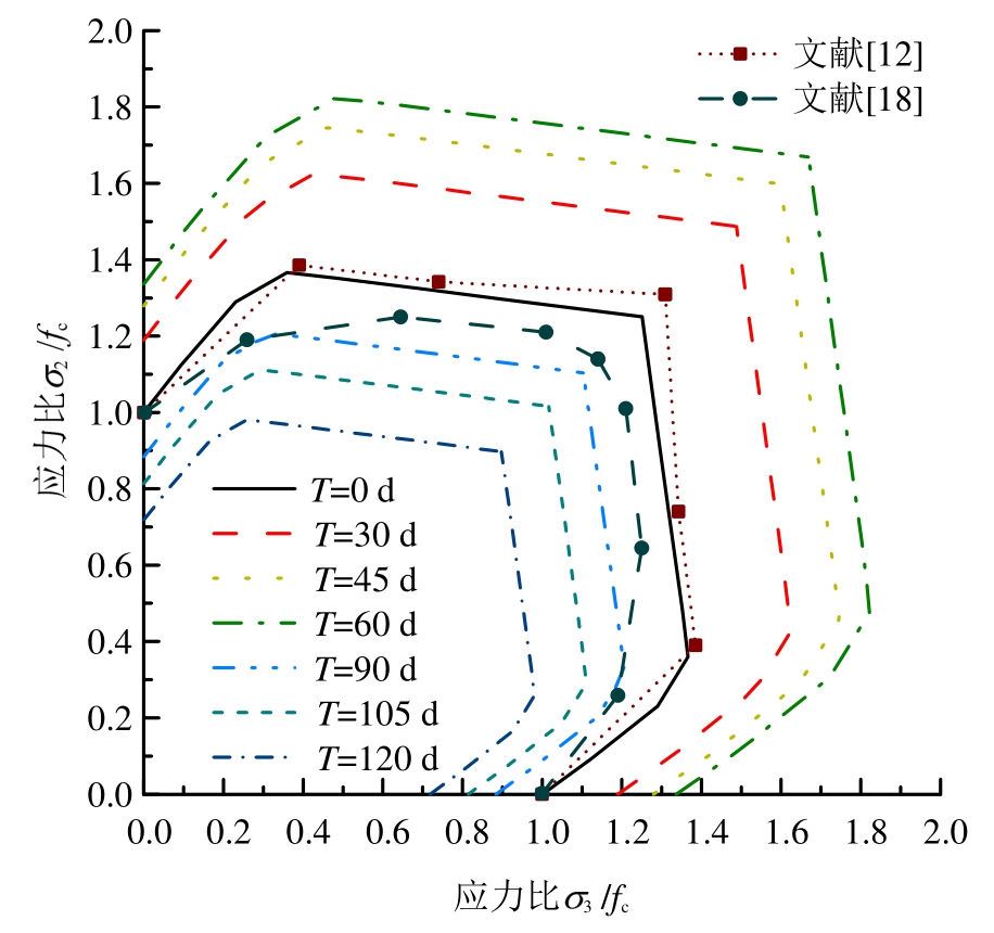 如图18所示,从预测的应力-应变曲线中进一步提取名义峰值应力获得不同侵蚀时期混凝土对应的双轴压-压强度包络线,其中fc=-22.850 MPa(未侵蚀混凝土单轴压缩强度)。图中同时显示了Li等[12]、Kupfer等[18]强度包络线试验数据。当T=0 d时,预测的未侵蚀混凝土曲线形状符合混凝土双轴压-压强度包络线一般特征[19],双轴受压下的混凝土抗压强度显著提高;随应力比(变化范围0~1)的增大,混凝土抗压强度先增大后减小;应力比为0.26时抗压强度达到最大,为单轴抗压强度的1.39倍;应力比为1时抗压强度是单轴抗压强度的1.25倍。不同侵蚀时期混凝土对应强度包络线具有相似规律。以T=60 d为界,当T在[0,60]区间时,随着侵蚀天数的增加,强度包络线呈现向外“扩张”的趋势;T=60 d时,各应力比对应的双轴强度均达到最大值,应力比为0.26和1时抗压强度分别是未侵蚀混凝土单轴抗压强度的1.82倍和1.67倍。当T在[60,120]区间时,强度包络线呈现向内“收缩”的趋势,且在[60,90]区间时“收缩”最为显著;T=120 d时,各应力比对应的双轴强度均达到最小值,应力比为0.26和1时抗压强度分别是未侵蚀混凝土单轴抗压强度的0.98倍和0.90倍。