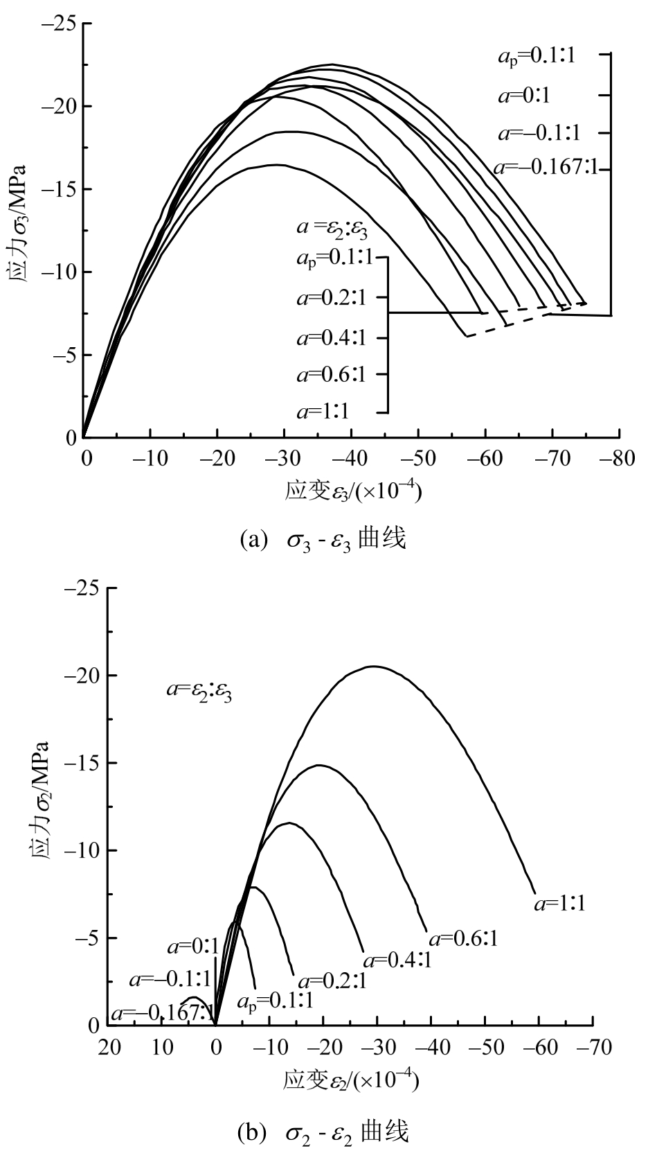 图15 双轴压-压应变比例加载工况下应力-应变曲线(T=0 d)