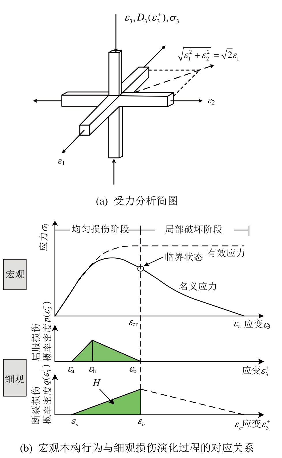 )峰值对应应变;εc为最大断裂损伤应变。εcr、εu为3方向对应特征压应变,满足![]()