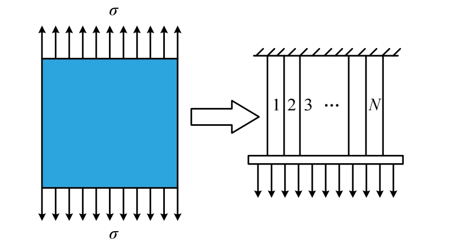 统计损伤理论忽略损伤的微观细节,将代表体积单元抽象为由N(N→∞)个细观单元(微弹簧、微杆件等,具有相同的截面积dA和刚度dk)组成的复杂系统,如图1所示。通过赋予每个微单元不同的力学参数(强度、特征应变等)并假设其服从某种统计分布形式,引入材料的细观非均质特性。