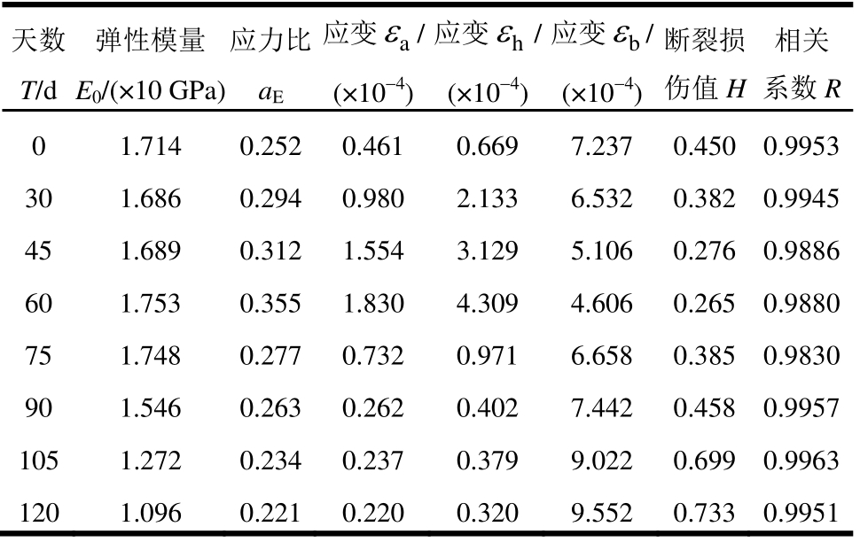 天数T/d弹性模量E0/(×10 GPa)应力比aE应变 aε/(×10-4)应变 hε/(×10-4)应变 bε/(×10-4)断裂损伤值H相关系数R 0 1.714 0.252 0.461 0.669 7.237 0.450 0.9953 30 1.686 0.294 0.980 2.133 6.532 0.382 0.9945 45 1.689 0.312 1.554 3.129 5.106 0.276 0.9886 60 1.753 0.355 1.830 4.309 4.606 0.265 0.9880 75 1.748 0.277 0.732 0.971 6.658 0.385 0.9830 90 1.546 0.263 0.262 0.402 7.442 0.458 0.9957 105 1.272 0.234 0.237 0.379 9.022 0.699 0.9963 120 1.096 0.221 0.220 0.320 9.552 0.733 0.9951