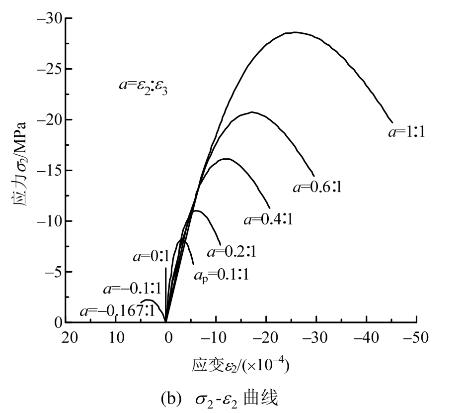 Fig.15 Stress-strain curves under biaxial compression in strain proportional loading cases (T=0 d)