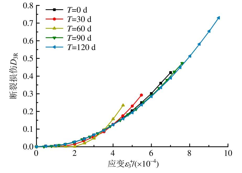 >0,且与3方向正交),定义为3方向对应的等效传递拉损伤应变,为ε1、ε2的函数,表达式为ε3+ =f (ε1 ,ε2)。对于单轴压缩,可令