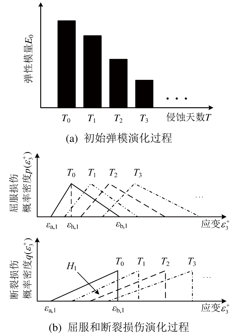 按照统计损伤理论的观点,硫酸盐侵蚀效应改变了混凝土微结构的组成成分和特征,改变了微裂纹萌生、扩展的形态以及损伤的累积演化过程,从而改变了混凝土宏观非线性的应力-应变行为。上述细观层次的影响可用2类参数表征,第1类:E0,表征微结构的改变对初始弹模的影响;第2类:εa、εh、εb和H(分别表征细观屈服和断裂两种损伤模式演化过程对应的三角形概率分布形态),反映侵蚀效应对损伤累积演化过程的影响。如图4所示,假设不同侵蚀时间T下混凝土对应的微结构特征和损伤演化过程的变化服从某种规律性。将E0、εa、εh、εb、H定义为硫酸盐侵蚀天数T(单位:d(天))的函数(本文忽略硫酸盐浓度等其它因素的影响),即: