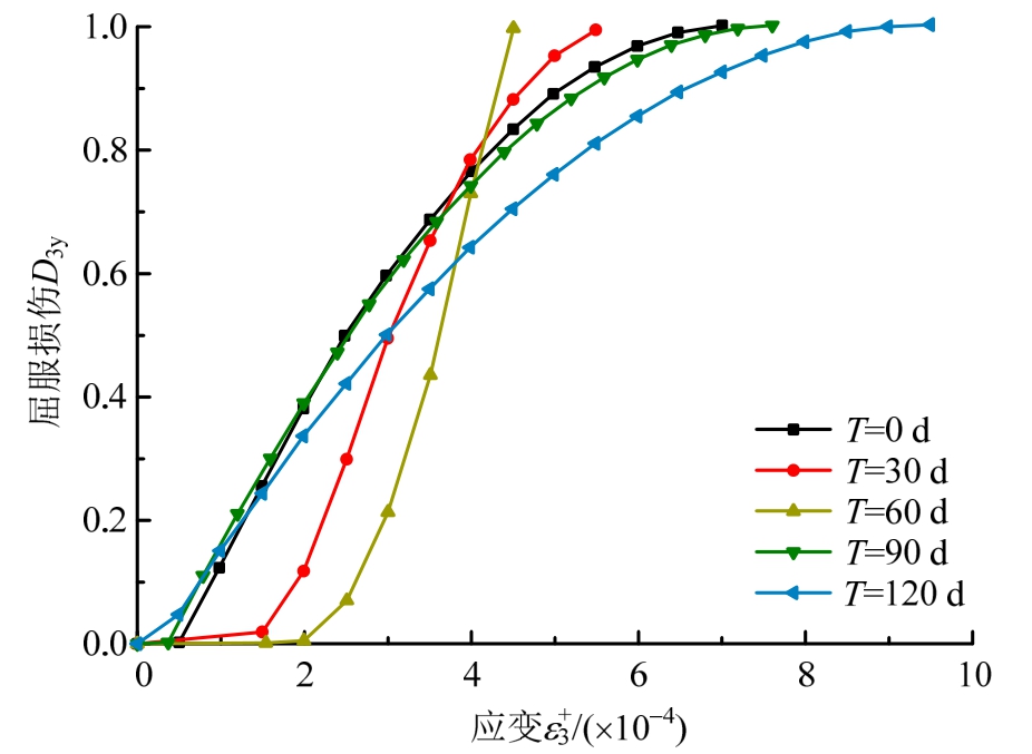 细观损伤演化机制:屈服损伤模式中εa、εh分别由60 d时的1.830×10-4、4.309×10-4呈指数型快速锐减到120 d时的0.220×10-4、0.320×10-4;而εb由 60 d 时的 4.606×10-4增大到 120 d 时的9.552×10-4。断裂损伤模式中H由60 d时的0.265增大到120 d时的0.733。