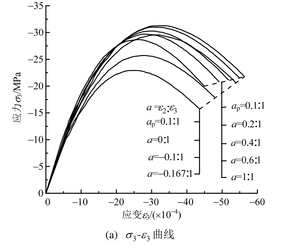 如图15(a)所示,未侵蚀混凝土(T=0 d) 3方向应力-应变曲线所形成的包络面呈现两个交叠面的形态。存在一最大峰值应力状态曲线,设对应加载应变比a=ap 。a在[-0.167,ap]区间时,曲线呈现向外扩张趋势,峰值应力状态和临界状态对应应力、应变值随着a的增大而增大,且增长迅速;a在[ap,1]区间时,曲线呈现向内收缩趋势,峰值应力状态和临界状态对应应力、应变值随着a增大而减小,且变化速率较慢。上述双轴压-压应力-应变曲线的变化趋势与文献[12]中的试验结果一致。如图16(a)、图17(a)所示,侵蚀混凝土3方向应力-应变曲线表现出类似的规律;T=60 d时,曲线下降段很短;T=120 d时,曲线下降段变的很长。