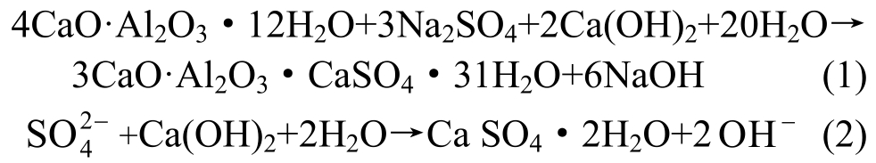 )跟水泥水化产物发生化学反应、物理结晶,生成膨胀性物质包括[4]:钙矾石(3CaO·Al2O3·CaSO4·31H2O)、石膏(CaSO4·2H2O)和硫酸钠盐结晶(Na2SO4·10H2O)等,改变了混凝土微结构组成成分和力学性质。主要反应方程式如下: