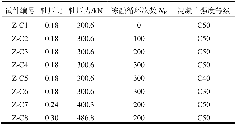 试件编号 轴压比 轴压力/kN 冻融循环次数NE 混凝土强度等级Z-C1 0.18 300.6 0 C50 Z-C2 0.18 300.6 100 C50 Z-C3 0.18 300.6 200 C50 Z-C4 0.18 300.6 300 C50 Z-C5 0.18 300.6 300 C40 Z-C6 0.18 300.6 300 C30 Z-C7 0.24 400.3 200 C50 Z-C8 0.30 486.8 200 C50