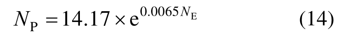 计算导致相同动弹性模量退化程度所需冻融循环次数NP,与本试验冻融循环次数NE进行拟合,并采用相同拟合模型,得到式(14):