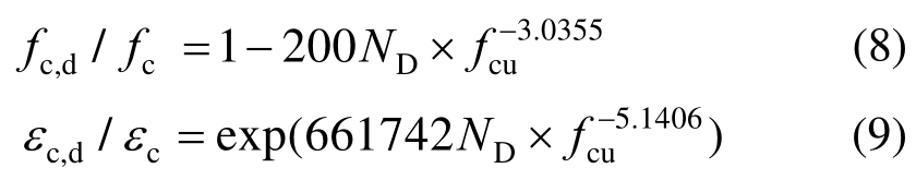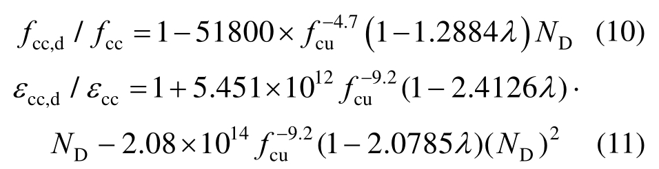 段安[6]首先对不同水灰比和不同冻融循环次数下的混凝土棱柱体试件进行了轴心抗压试验,建立了混凝土本构模型中主要参数随冻融循环次数ND和立方体抗压强度fcu的变化关系,如式(8)、式(9)所示:
