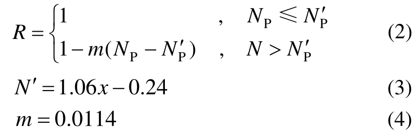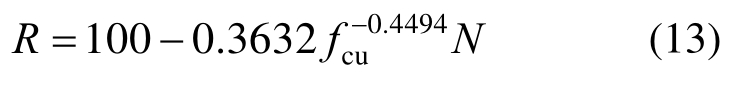 随后,对Petersen试验的冻融循环次数进行等效:由于文献[3]缺乏冻融后混凝土强度数据,故可采用相对动弹性模量RDME作为等效的原则。根据本研究在前期已建立的RDME与冻融循环次数及混凝土强度的关系[26],如式(13)所示: