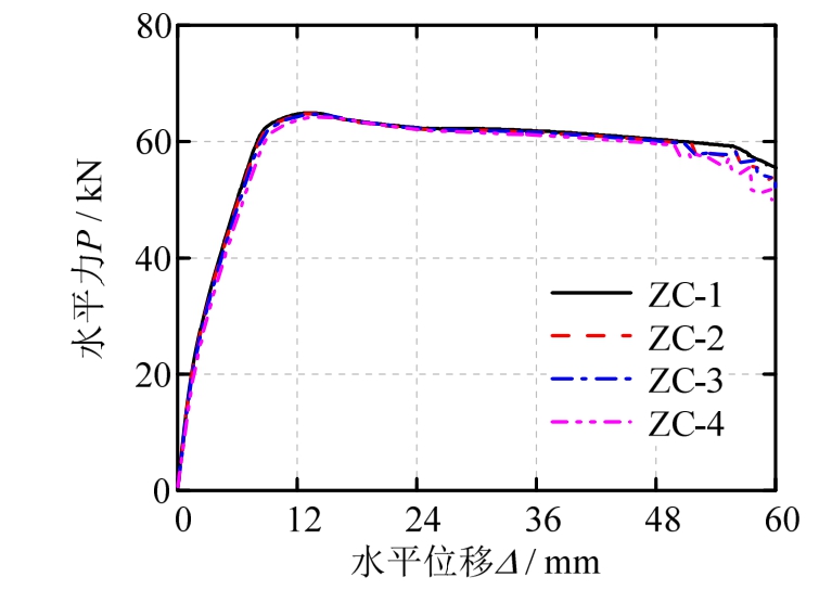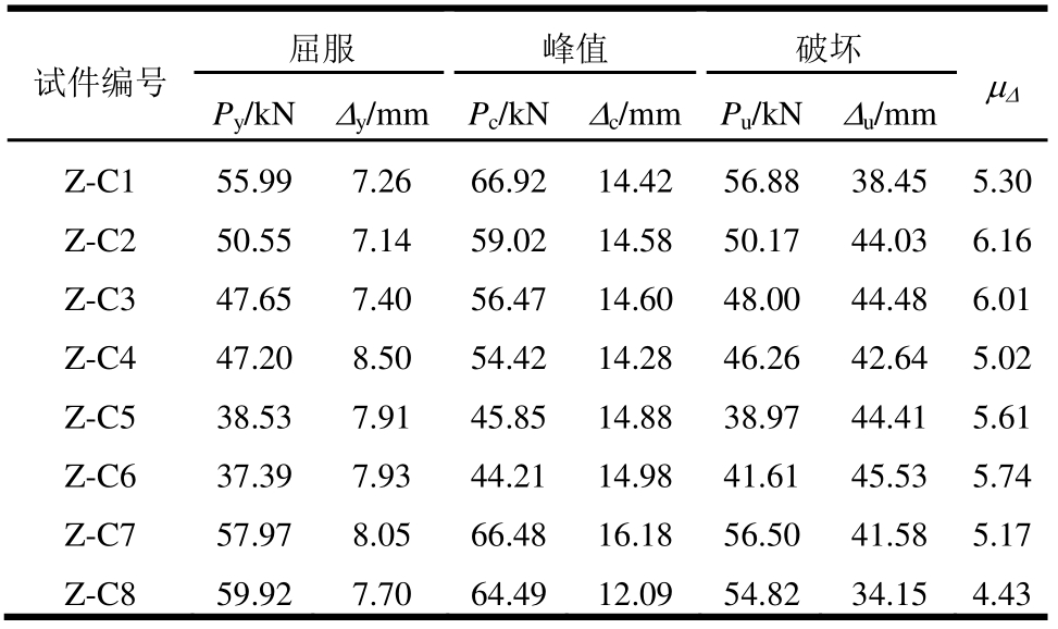 屈服 峰值 破坏试件编号Py/kNΔy/mmPc/kNΔc/mmPu/kNΔu/mmμΔ Z-C1 55.99 7.26 66.92 14.42 56.88 38.45 5.30 Z-C2 50.55 7.14 59.02 14.58 50.17 44.03 6.16 Z-C3 47.65 7.40 56.47 14.60 48.00 44.48 6.01 Z-C4 47.20 8.50 54.42 14.28 46.26 42.64 5.02 Z-C5 38.53 7.91 45.85 14.88 38.97 44.41 5.61 Z-C6 37.39 7.93 44.21 14.98 41.61 45.53 5.74 Z-C7 57.97 8.05 66.48 16.18 56.50 41.58 5.17 Z-C8 59.92 7.70 64.49 12.09 54.82 34.15 4.43