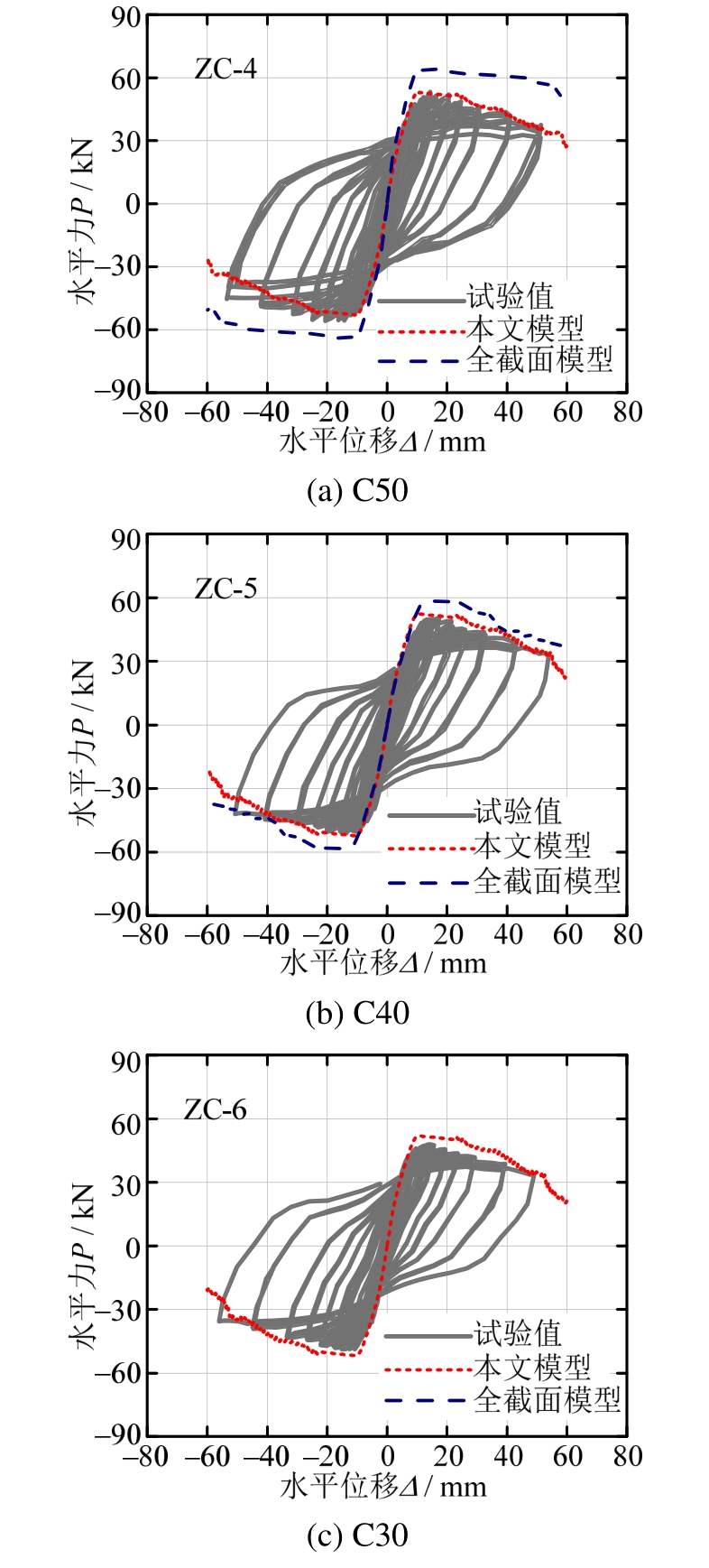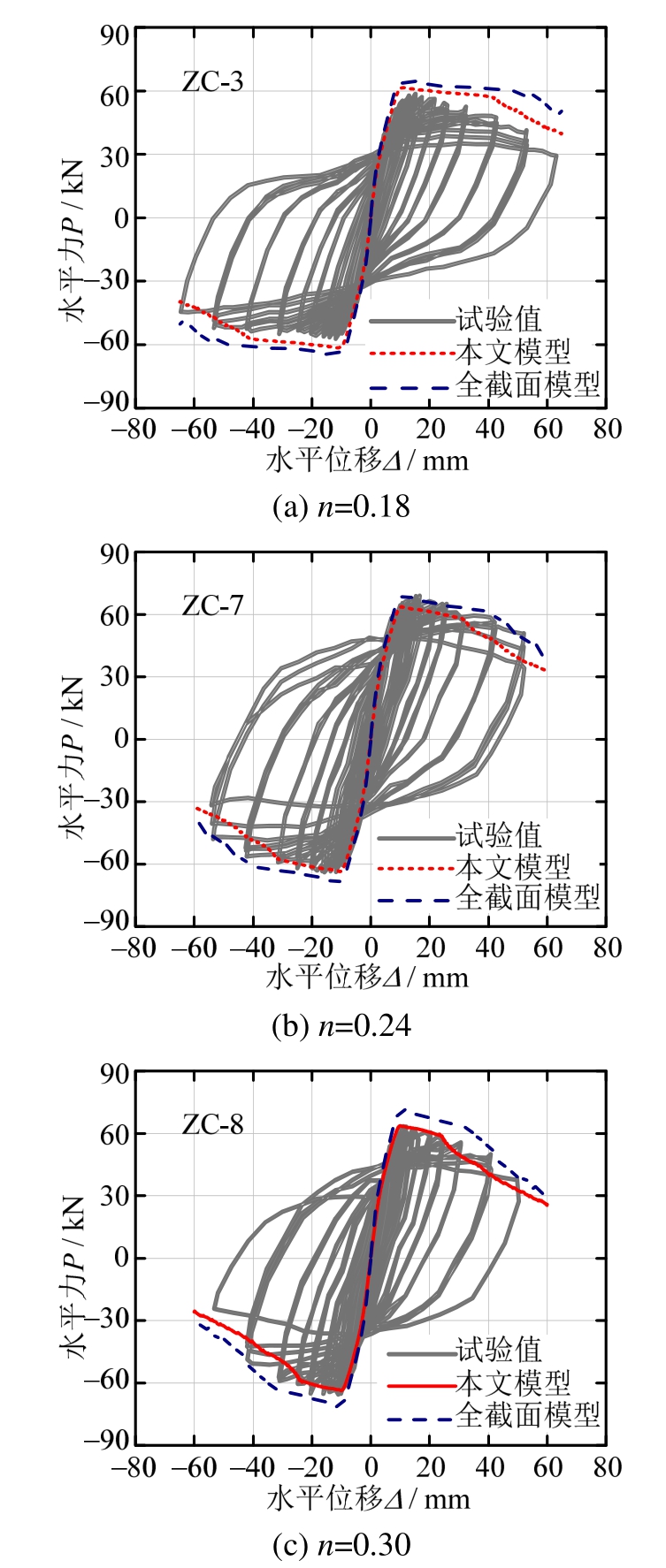 采用静力推覆分析方法分别对本文提出的模型和全截面模型进行计算,与试验结果进行对比,并根据不同试验参数分类详述如后文所示。