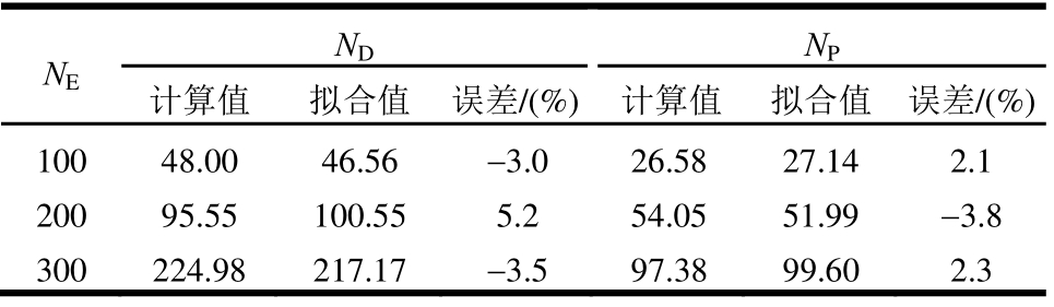 NE NDNP计算值 拟合值 误差/(%) 计算值 拟合值 误差/(%)100 48.00 46.56 -3.0 26.58 27.14 2.1 200 95.55 100.55 5.2 54.05 51.99 -3.8 300 224.98 217.17 -3.5 97.38 99.60 2.3