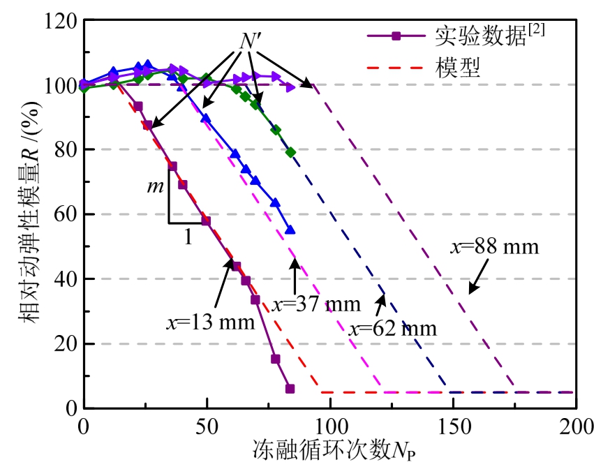 综上,现有混凝土冻融损伤模型较为匮乏,尚未考虑冻融损伤的不均匀性,且没有针对抗震分析领域的应用。另一方面,诸多学者[9,11―12]指出,研究中冻融循环方案的差异造成了不同研究结果无法进行横向对比分析。故本文采用RDME作为冻融损伤参数,基于既有的冻融混凝土材性试验,提出可考虑冻融损伤不均匀性的混凝土退化模型,并建立不同冻融循环试验之间的等效循环次数,以实现数据的归纳与对比,最后根据8榀冻融后RC框架柱拟静力试验数据进行验证,并与既有冻融损伤模型进行对比分析。