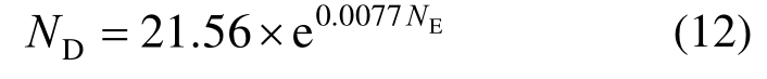 由于冻融循环试验参数、混凝土尺寸以及未损伤混凝土强度在内的这些因素均会导致相同冻融循环次数下的混凝土损伤程度不尽相同,因此在采用与冻融循环次数N这一参数相关的模型时,需要对不同试验条件下的该参数进行等效。为实现本文所需的不同研究之间冻融循环次数的对比,首先对本试验和段安[6]试验进行等效:根据本文试验环境下的冻融混凝土材性试验数据[9],采用段安[6]所提出的式(8)计算导致相同混凝土强度退化程度所需冻融循环次数ND,与本试验冻融循环次数NE进行拟合,选取指数函数形式为拟合模型,得到式(12):