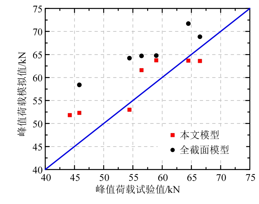 综上,各次模拟结果(ZC2~ZC8)的峰值荷载与试验数据对比如图13所示,可以看到本文模型分布于对角线的两侧,全截面模型计算点均分布在对角线的上方,且误差总体大于本文模型。