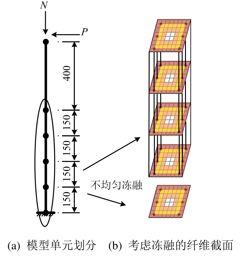 由前述试验可知,冻融后RC框架柱的破坏模式仍以弯曲破坏为主,同时为考虑冻融循环作用对混凝土材性的影响,采用基于单轴材料本构的纤维截面模型模拟RC柱的弯矩曲率关系,通过对曲率沿柱高度方向的积分即可得到柱的侧向位移。单元类型采用基于位移法的非线性梁柱单元,为得到较为精确的结果,通常需要将构件划分为若干单元,根据构件配筋及等效塑性铰高度[16],沿柱高划分单元如图3(a)所示。为确定截面分析所需的纤维数量,进行了灵敏度分析,得到40×40个纤维可基本实现计算精度和效率的平衡。