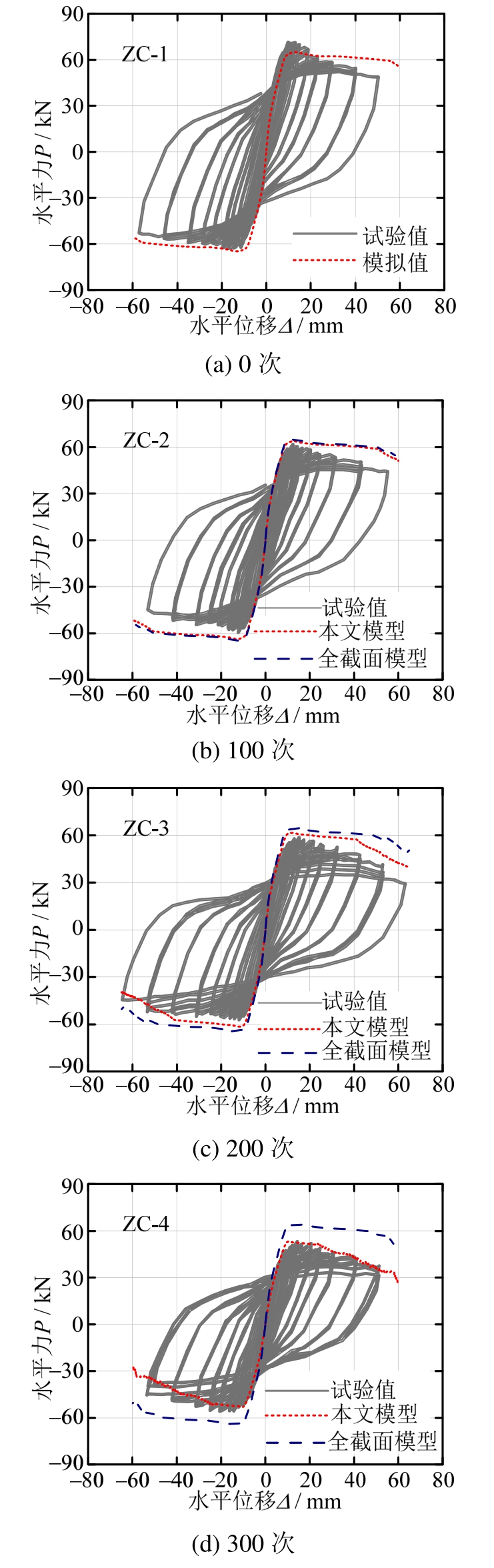对不同冻融循环次数下的RC柱数值分析结果与试验滞回曲线对比如图9所示。由未冻融RC构件(ZC-1)的模拟结果与试验数据对比(图9(a))可看到,在负向加载阶段模拟曲线与滞回曲线的包络线吻合较好,而在正向加载阶段峰值荷载试验值大于模拟结果。由试验滞回曲线可以看出,在正向加载时,试件的初始刚度值较大,快速达到峰值荷载,同时过峰值后的退化速度也较负向更快,造成正负向明显不对称的特征,可能是由于在竖向加载时出现初始偏心造成。因此上述模拟与试验不一致的情况主要是由于试验误差产生,故本文采用的数值建模方法可作为后续冻融模型分析的前提。