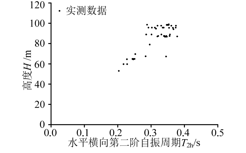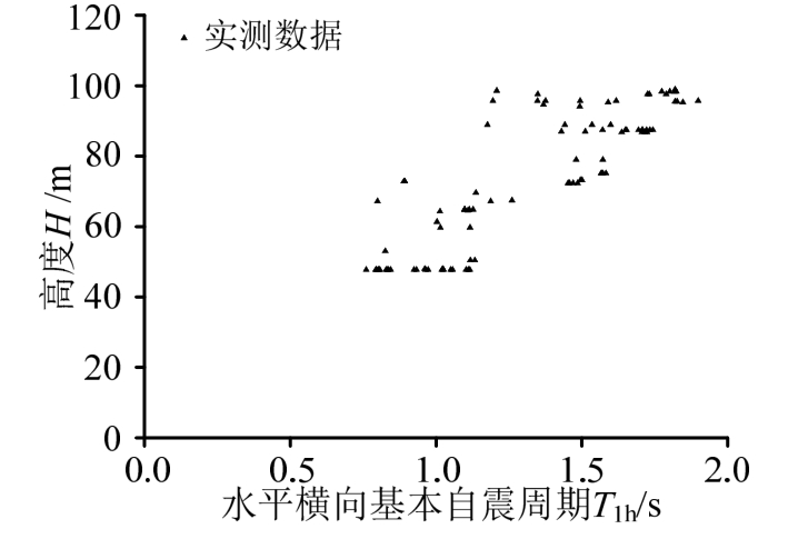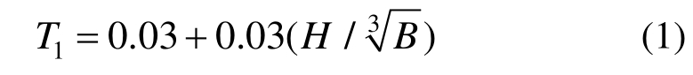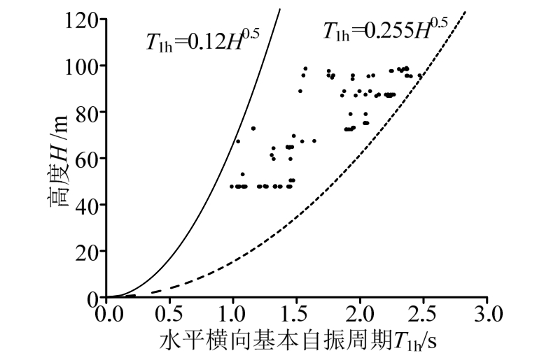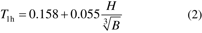 式中:T1h为结构水平横向基本自振周期;H为结构高度,且45m <H < 100m;B为结构平面尺寸中较短边的长度。该方程的回归分析的决定系数R2 = 0.742。