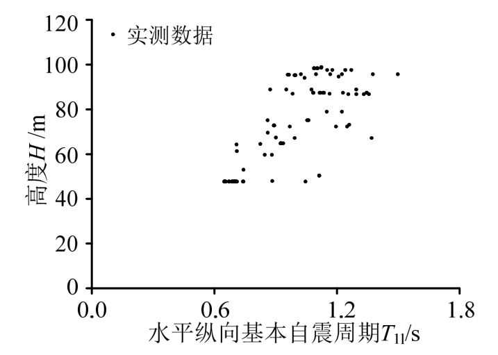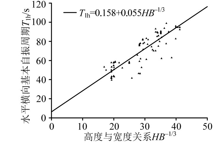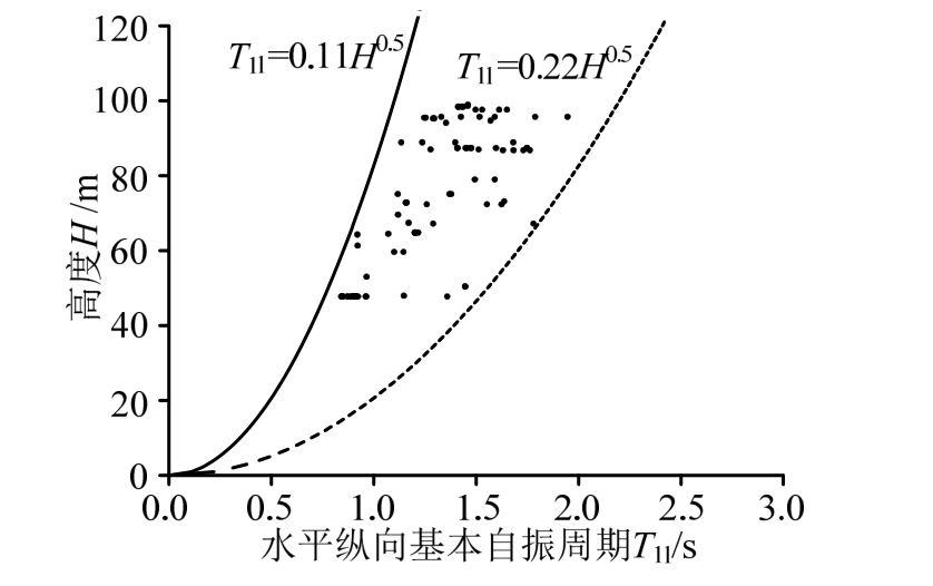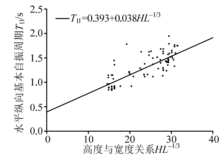 式中:T1l为结构水平纵向基本自振周期;L为结构平面尺寸中较长边的长度。该方程的回归分析的决定系数R2= 0.622 。