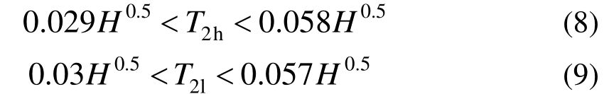 式中:T2h/T1h 的总体均值为0.220,离散系数为0.032;T2l/T1l 的总体均值为0.278,离散系数为0.029。该结果符合高层建筑结构基本原理[22]。