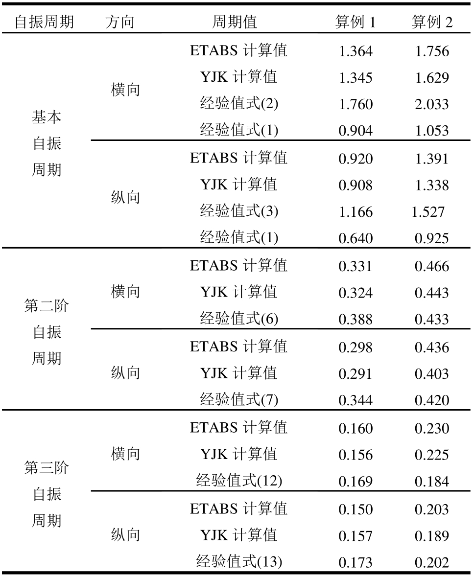 自振周期 方向 周期误差率 算例1 算例2下限值 式(4) 1.036 1.118基本自振周期横向 经验值 式(2) 1.760 2.033上限值 式(4) 2.202 2.376下限值 式(5) 0.950 1.025纵向 经验值 式(3) 1.166 1.527上限值 式(5) 1.900 2.049下限值 式(8) 0.251 0.270第二阶自振周期横向 经验值 式(6) 0.388 0.433上限值 式(8) 0.501 0.540下限值 式(9) 0.259 0.279纵向 经验值 式(7) 0.344 0.420上限值 式(9) 0.492 0.531下限值 式(14) 0.147 0.158第三阶自振周期横向 经验值 式(12) 0.169 0.184上限值 式(14) 0.199 0.214下限值 式(15) 0.155 0.168纵向 经验值 式(13) 0.173 0.202上限值 式(15) 0.242 0.261