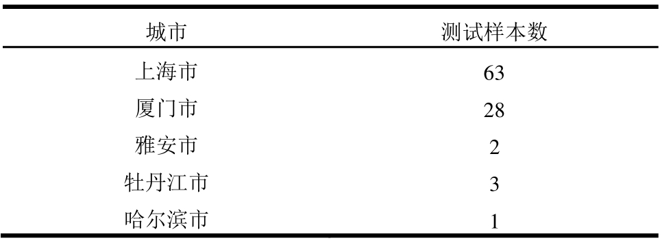 城市 测试样本数上海市 63厦门市 28雅安市 2牡丹江市 3哈尔滨市 1