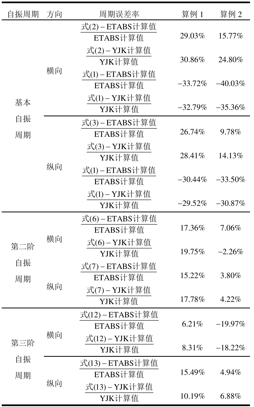 自振周期方向 周期误差率 算例1 算例2式(2)ETABS ETABS-计算值计算值 29.03% 15.77%(2)YJK YJK式 计算值计算值 30.86% 24.80%-横向式(1)ETABS ETABS-计算值计算值 -33.72% -40.03%基本自振周期式 计算值计算值 -32.79% -35.36%(1)YJK YJK-式(3)ETABS ETABS-计算值计算值 26.74% 9.78%式 计算值计算值 28.41% 14.13%(3)YJK YJK-纵向式(1)ETABS ETABS-计算值计算值 -30.44% -33.50%式 计算值计算值 -29.52% -30.87%(1)YJK YJK-式(6)ETABS ETABS-计算值计算值 17.36% 7.06%第二阶自振周期横向 式 计算值计算值 19.75% -2.26%(6)YJK YJK-式(7)ETABS ETABS-计算值计算值 15.22% 3.80%纵向 式 计算值计算值 17.78% 4.22%(7)YJK YJK-式(12)ETABS ETABS-计算值计算值 6.21% -19.97%横向第三阶自振周期式(12)YJK YJK-计算值计算值 8.31% -18.22%式(13)ETABS ETABS-计算值计算值 15.49% 4.94%纵向式(13)YJK YJK-计算值计算值 10.19% 6.88%